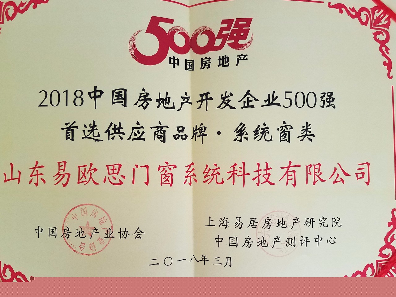 山東易歐思門窗系統科技有限公司榮獲“2018中國房地產開發企業500強首選供應商品牌·系統窗類”;