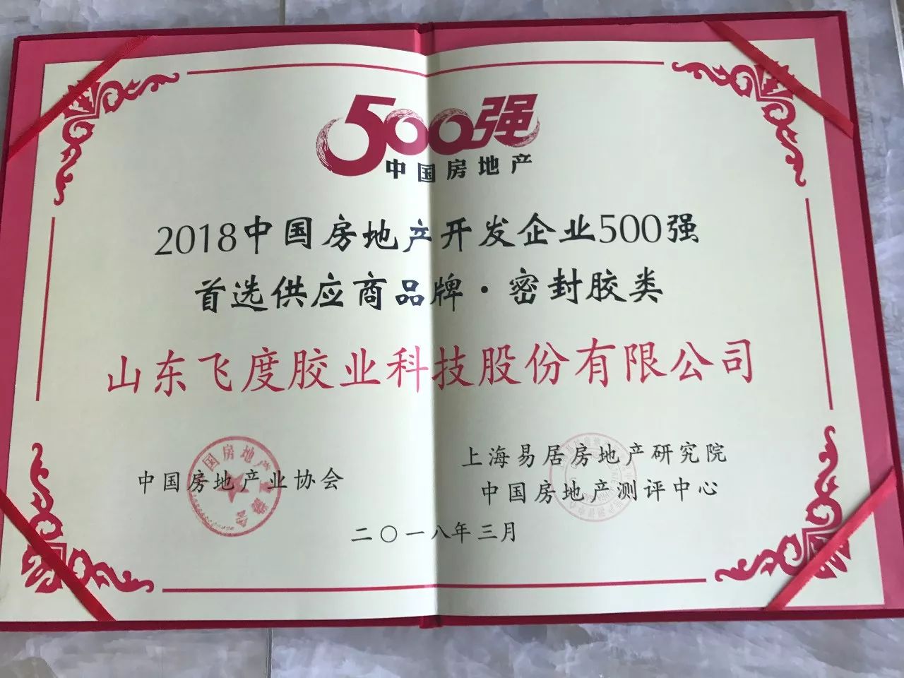 山東飛度膠業科技股份有限公司榮獲“2018中國房地產開發企業500強首選供應商品牌·密封膠類”。